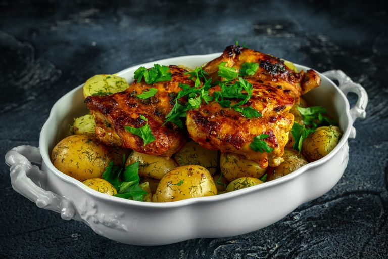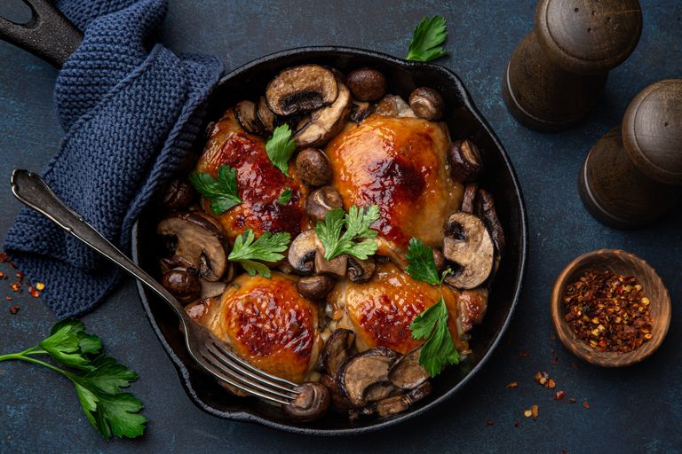 - Розігрійте сковорідку з олією та викладіть на неї курячі стегна. Обсмажуйте їх до готовності протягом 30 хвилин з обох сторін.