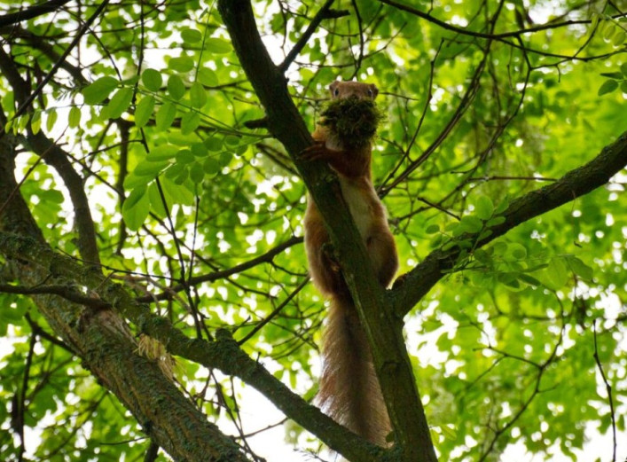 Чорнобильський Радіаційно-екологічний Біосферний Заповідник. Вивірка звичайна (Sciurus vulgaris), більш знана як білка, будує у лісі кулясті гнізда, які називаються гайнами. Вони розташовані високо на деревах між надійними