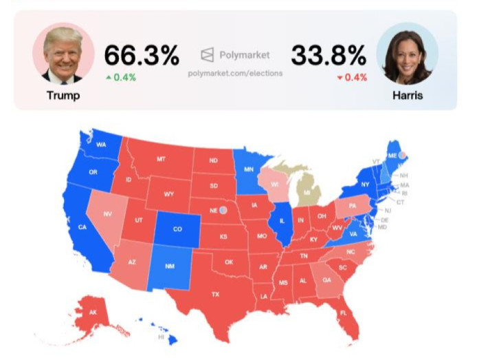 На платформі Polymarket відбувся значний перекіс у прогнозах щодо майбутніх виборів у США: Дональд Трамп отримав 66,3% ймовірності перемоги, тоді як Камала Харріс — лише 33,8%. Такі дані наводить видання The Wall Street Journal. Ще на