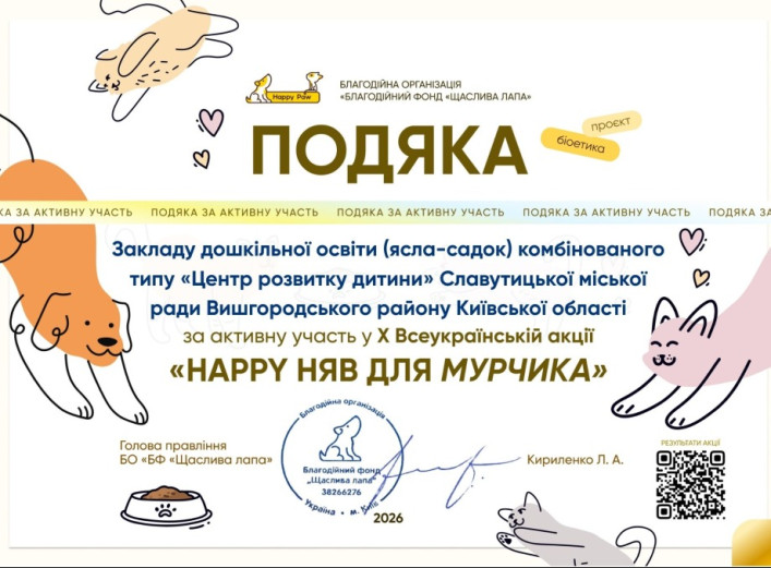 Заклад дошкільної освіти "Центр розвитку дитини" у Славутичі долучився до X Всеукраїнської благодійної акції "Happy Няв для Мурчика". Завдяки спільним зусиллям вихованців, батьків і колективу закладу вдалося зробити внесок у допомогу тваринам,