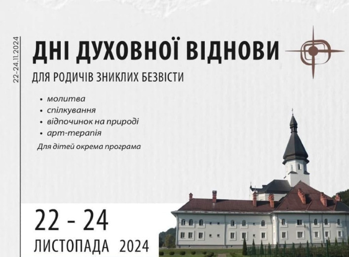 Храм в честь ікони Божої Матері "Неустанна Поміч" Української греко-католицької церкви у Славутичі запрошує родини військовослужбовців, зниклих безвісти, на дні духовної віднови, які відбудуться у Гошеві з 22 по 24 листопада 2024 року. Для