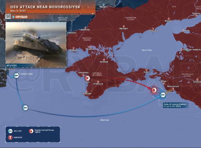 1 травня поблизу Новоросійська під час комбінованої атаки із застосуванням ударних безпілотників і морських дронів було збито російський літак, імовірно Су-30. Про це повідомляють моніторингові ресурси та підтверджують російські воєнні кореспонденти