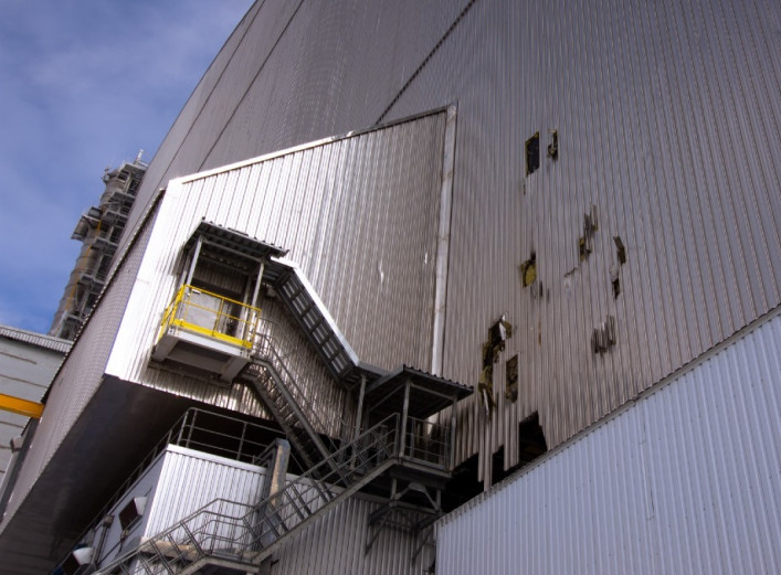 а також обладнання кранів. Виявлено наскрізні руйнування площею до 15 м², дефекти обшивки до 200 м², а також пошкодження мембран герметизації в кількох зонах. Радіаційний фон на території НБК-ОУ та ДСП ЧАЕС залишається