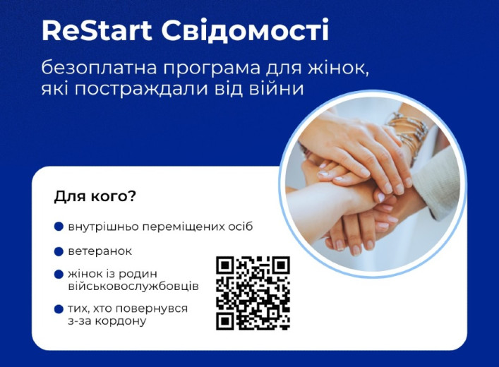 Жінки, які постраждали внаслідок війни — ветерани, переселенки, дружини військовослужбовців та ті, хто повернулися з-за кордону — можуть безкоштовно долучитися до програми ReStart Свідомості, що допомагає розпочати новий особистий