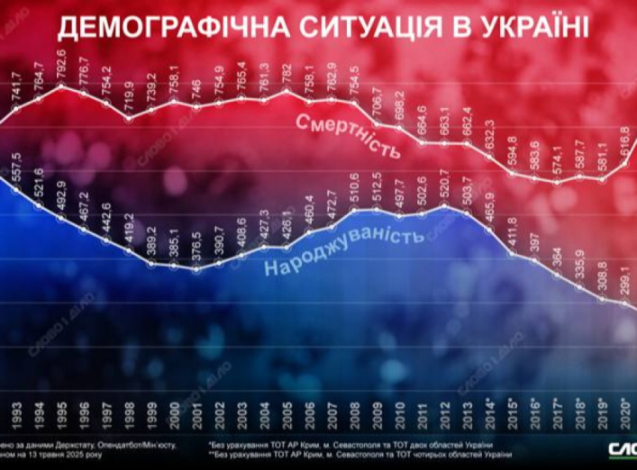 У 2024 році в Україні зафіксовано один із найгірших демографічних показників за всю історію незалежності — смертність утричі перевищила народжуваність. Про це свідчать офіційні статистичні дані, оприлюднені Державною службою статистики