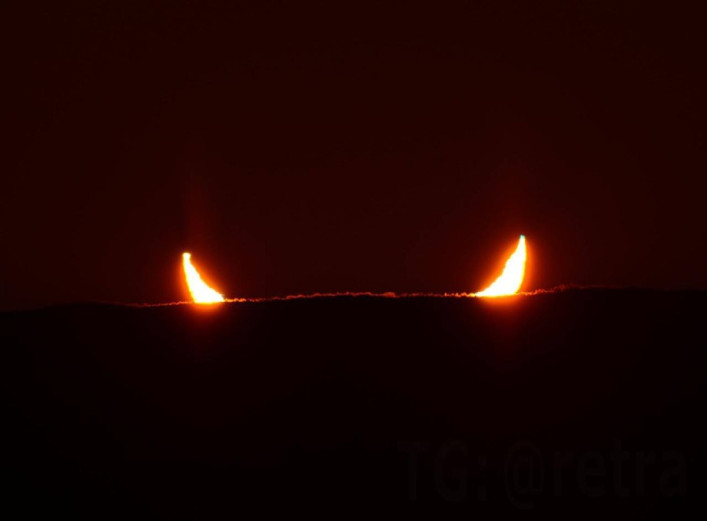 закрив приблизно 85% диска Сонця, створивши оптичну ілюзію — тонка смужка світла виглядала як два вогняні виступи. Це явище в астрономії називають ефектом «рогів диявола» через характерну форму затемненого світила. Автор