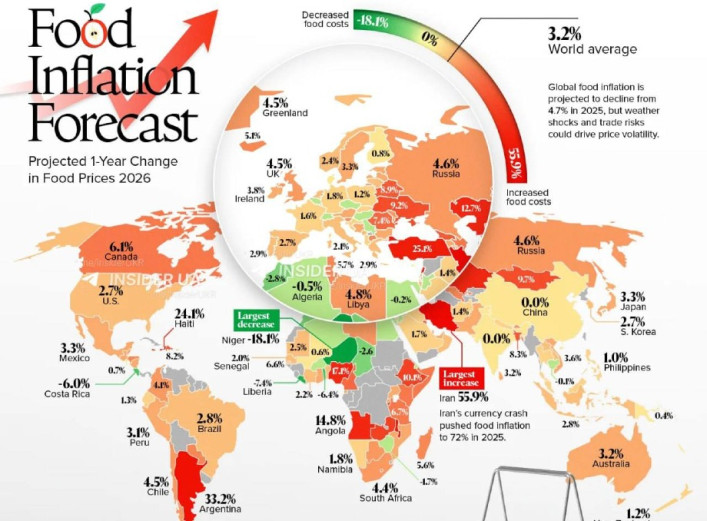 Україна увійшла до переліку 15 країн світу, де у 2026 році очікується найбільше зростання цін на продукти харчування. Прогнозований показник для нашої країни становить 9,2% у річному вимірі. Про це йдеться у прогнозі Food Inflation Forecast,