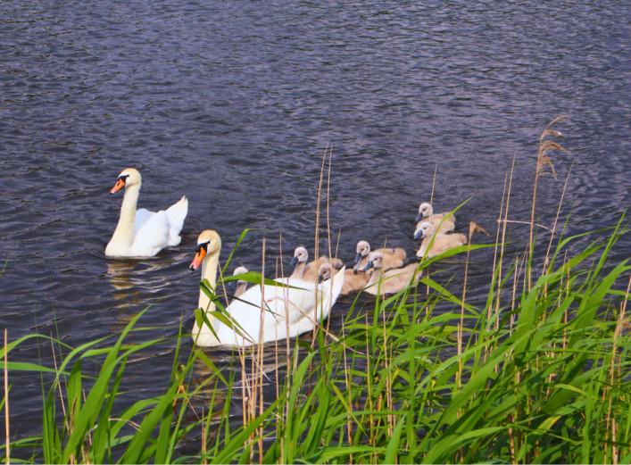 Білокрила пара оселилася на знайомій водоймі та вже вивела сімох пташенят. Навесні озеро знову ожило — спокійна вода, обережні рухи птахів і присутність нового життя привертають увагу місцевих. Це повернення стало особливим для багатьох.