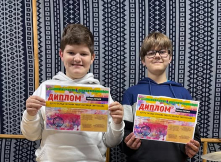 Дует у складі Лева Чернова та Святослава Кравця, учнів відділу народних та естрадних інструментів Дитячої школи мистецтв, здобув І премію у IV Міжнародному конкурсі талантів "Палітра талантів". Про це повідомляє Оксана Несмачна у фейсбук. Юні